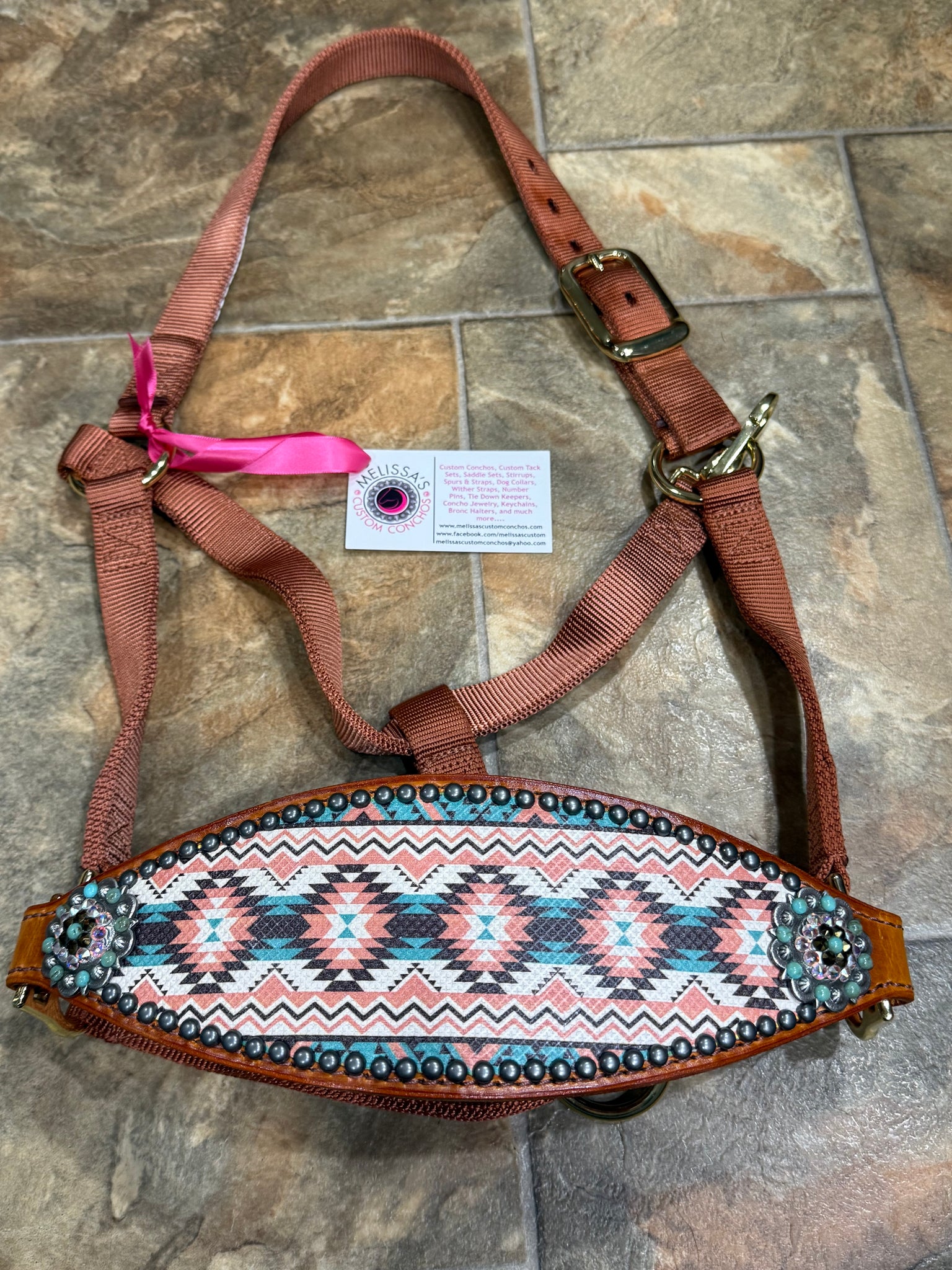 Aztec overlay with Antique Silver conchos and hardware. Turquoise, bronze, and crystal AB crystals. Sand Weaver fully adjustable halter.