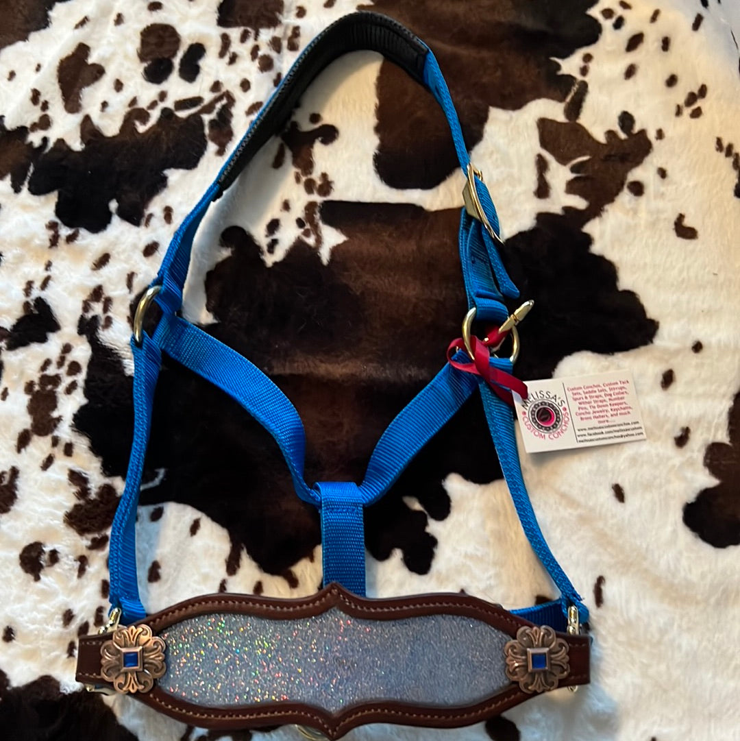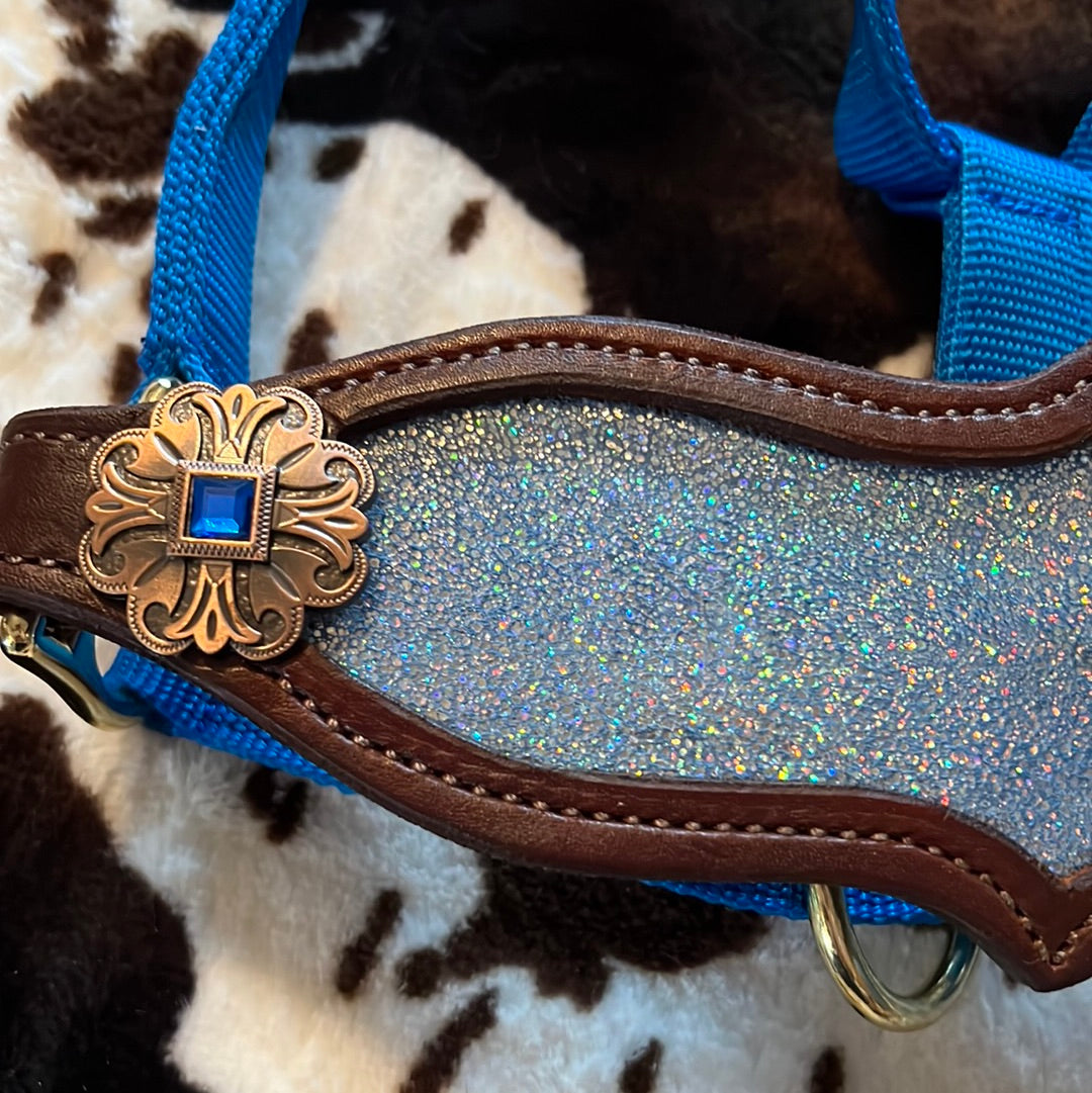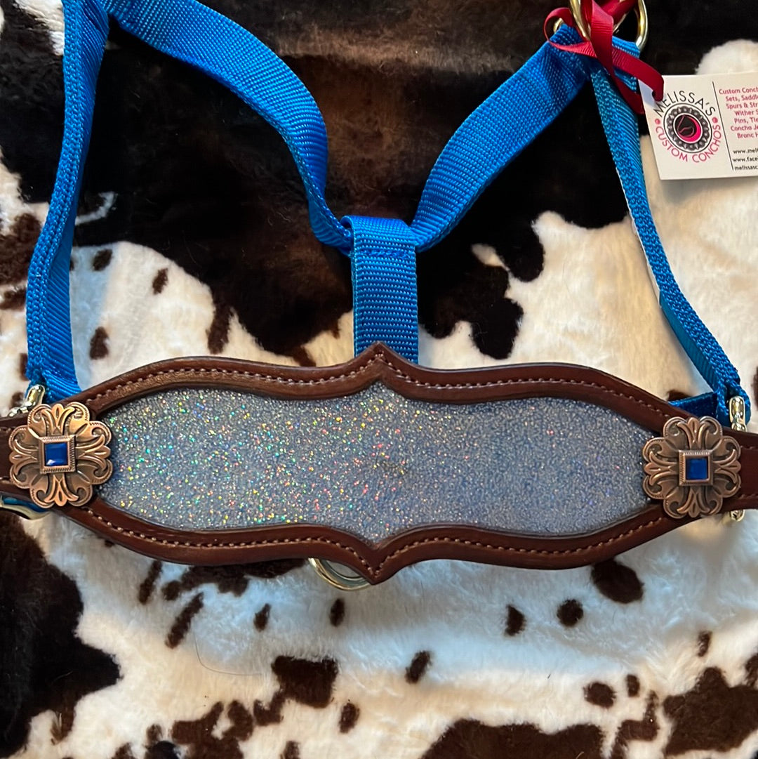 Blue sparkly Bronc halter with 1-1/2 inch copper conchos with blue crystals. Medium leather. Blue Weaver fully adjustable halter. Horse size.
