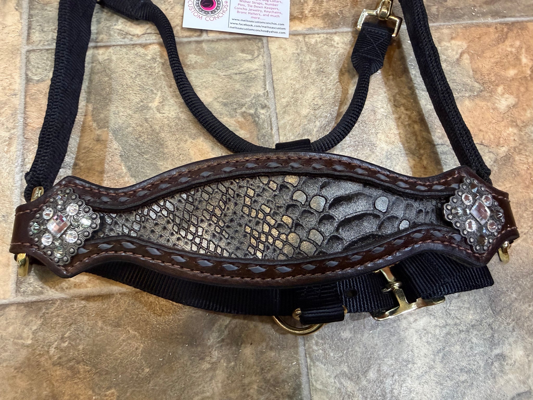 Gray/Black Mermaid overlay with Antique Silver conchos. Clear and Black Diamond crystals. Chocolate oil. GRay Buckstitch. Black Hamilton fully adjustable halter.