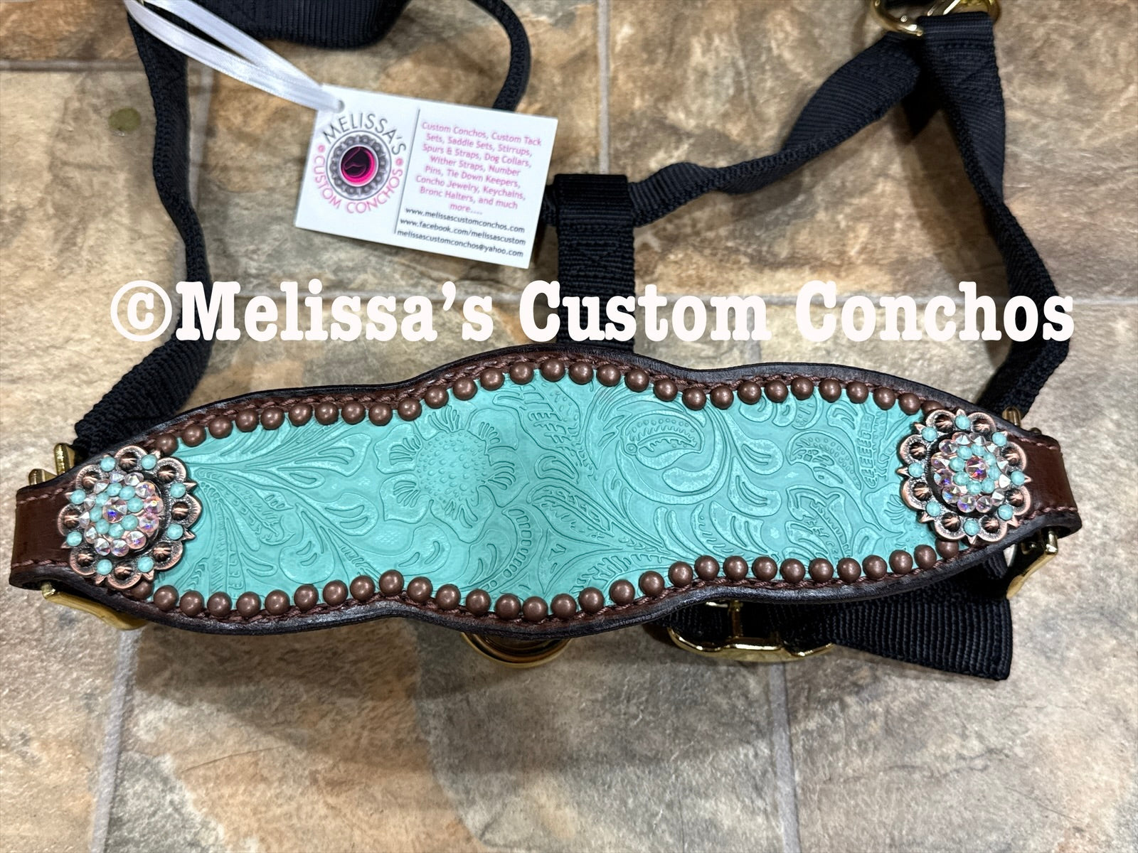 Mint Floral overlay with copper conchos and hardware. Mint and Crystal AB crystals. Medium leather. Black Weaver fully adjustable halter. horse size.