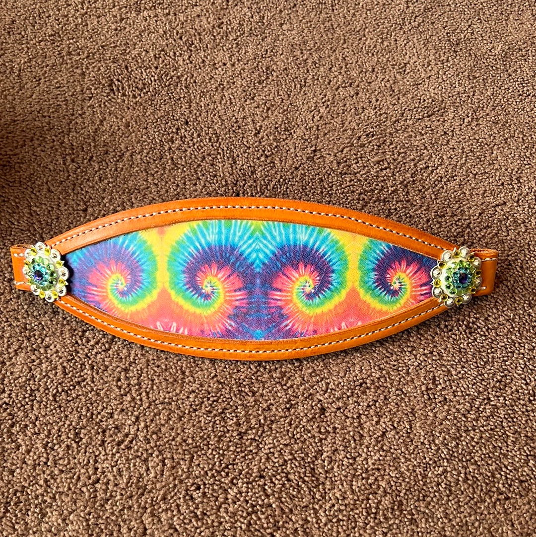 Tie Dye Inlay with Shiny Silver conchos and hardware. Light Turquoise, Heliotrope, Peridot and Citrine crystals. Beige leather. Turquoise Weaver fully adjustable halter. Small horse size.