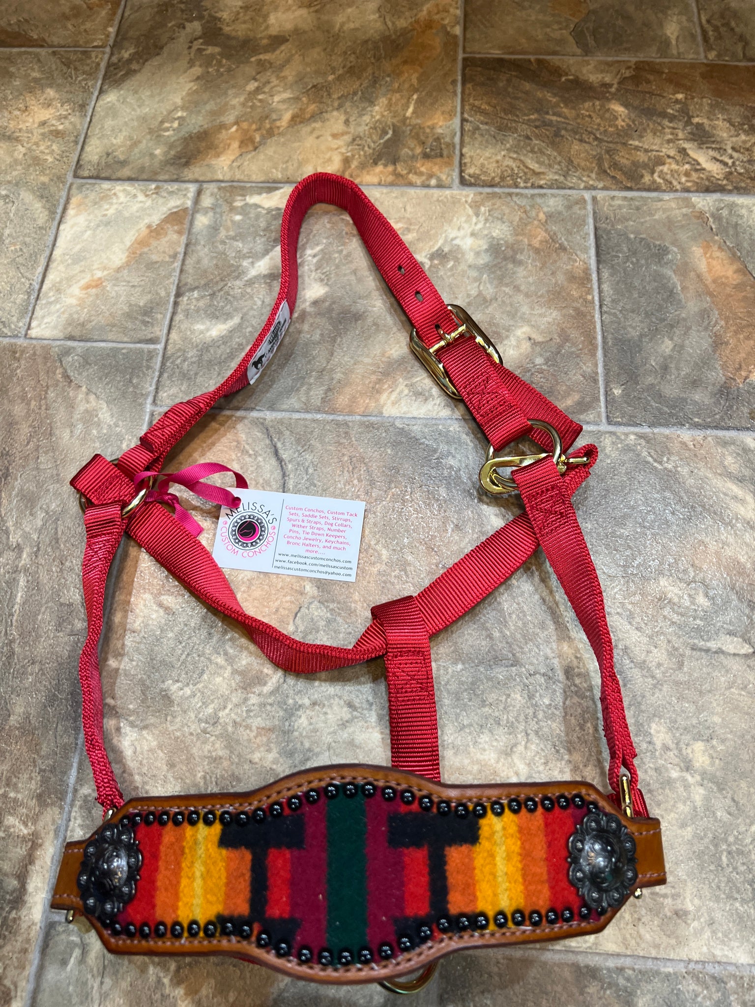Wool Bronc halter with black 1-1/2 inch conchos. Red Weaver fully adjustable halter. Horse size.