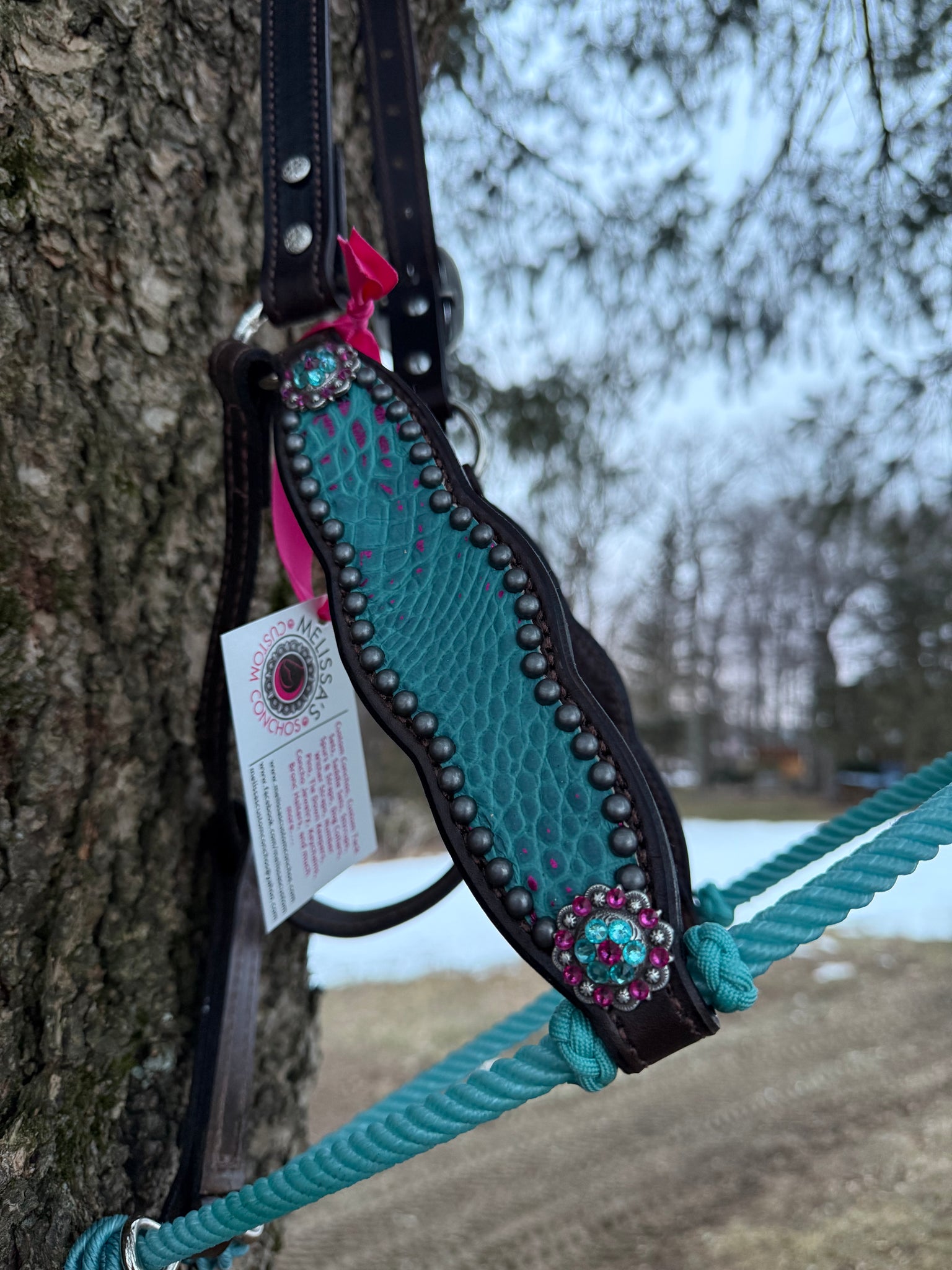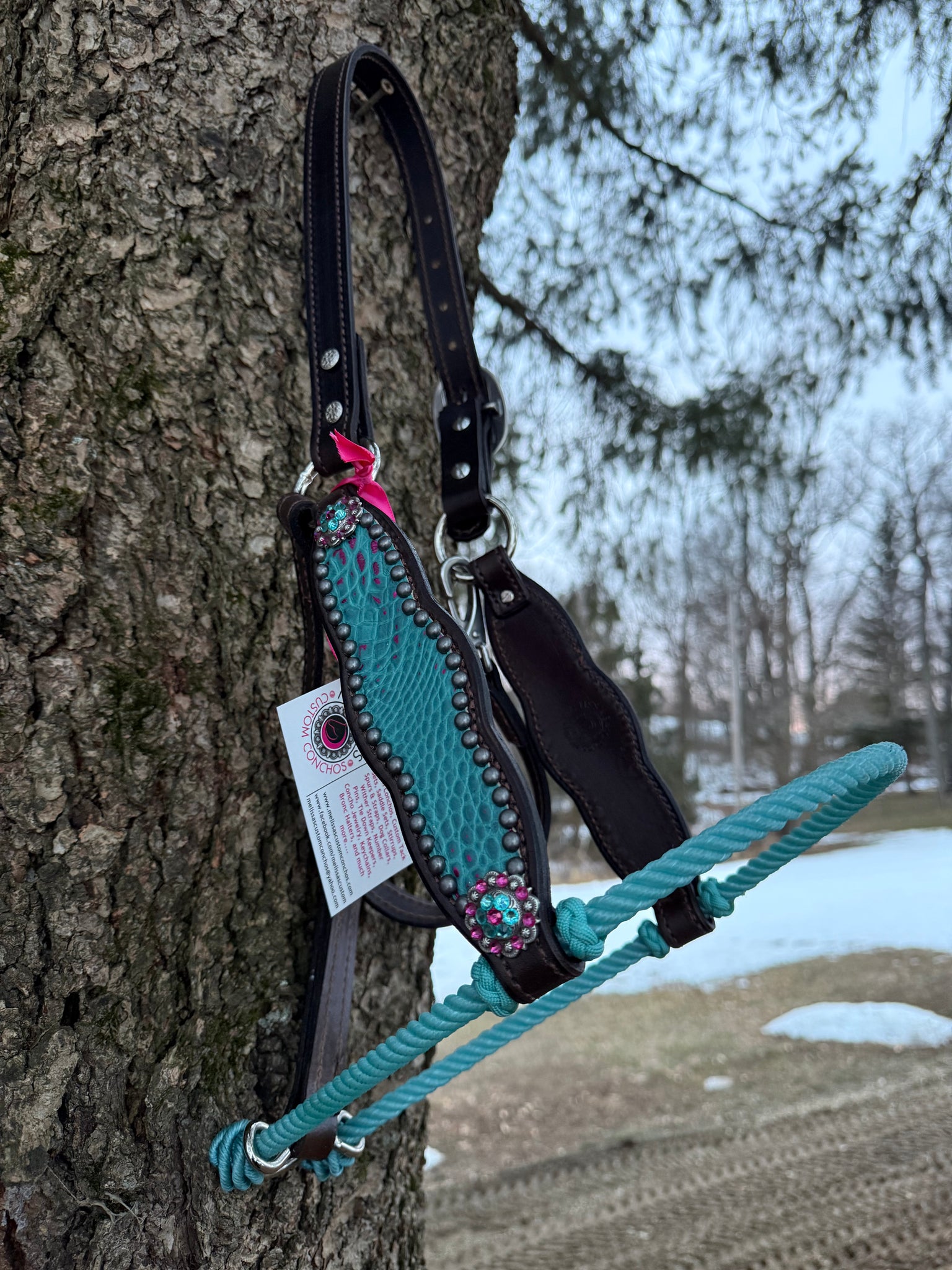 Turquoise Gator with Fuchsia all leather lariat halter.