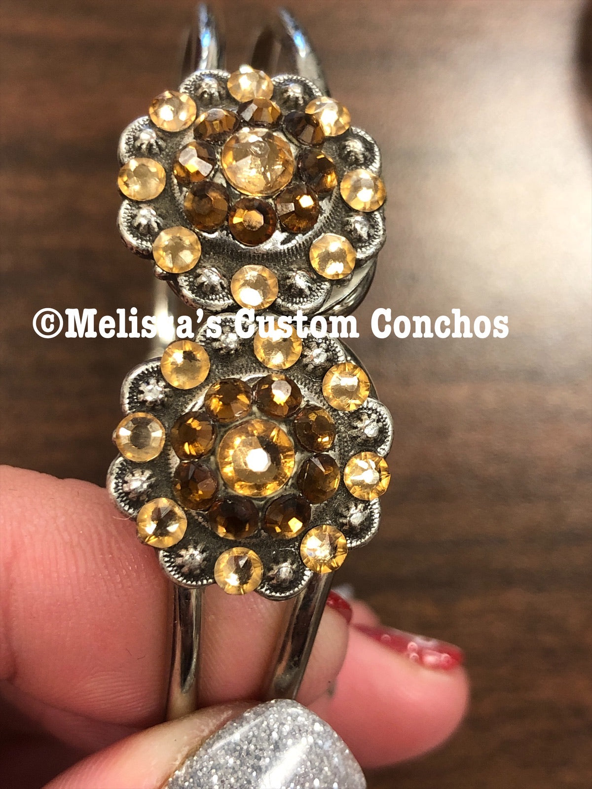 Smoked Topaz and Light Colorado Topaz on antique conchos on a hinged metal bracelet. 3/4 inch conchos. 7-1/2 inch round