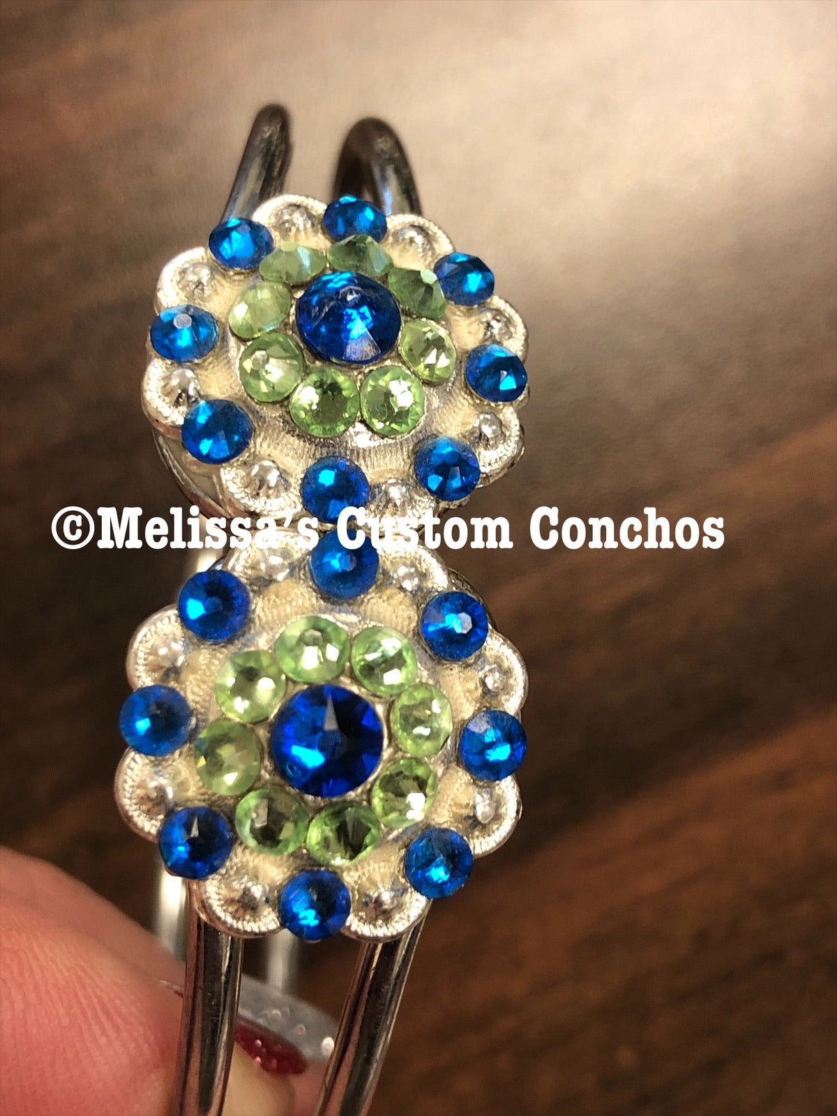 Capri Blue and Peridot on shiny conchos on a hinged metal bracelet. 3/4 inch conchos. 7-1/2 inch round