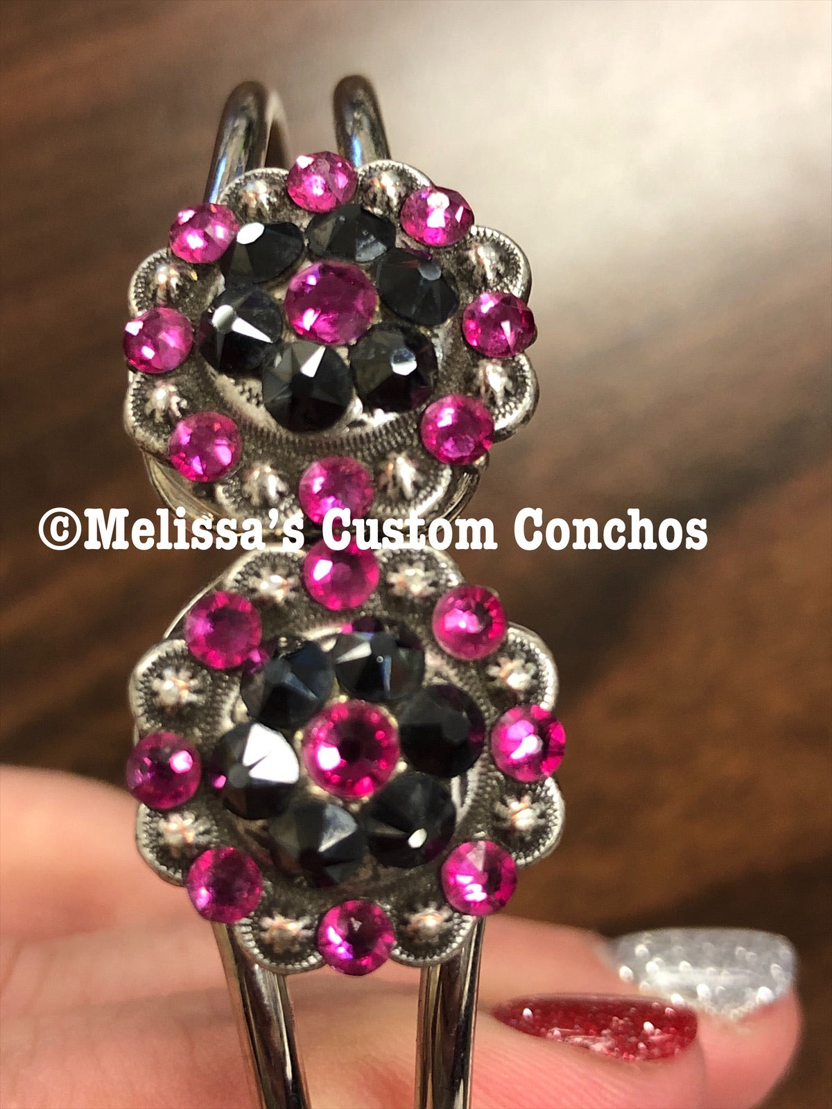 Fuchsia and Jet Black on antique conchos on a hinged metal bracelet. 3/4 inch conchos. 7-1/2 inch round