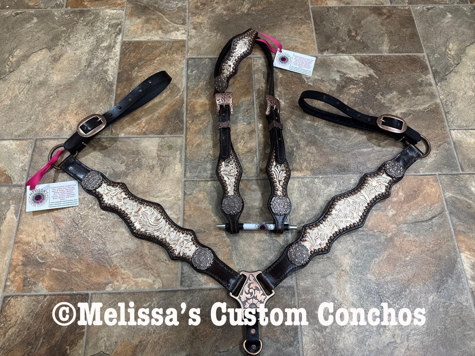 Chocolate oil tack set. Made by Melissa’s Custom Conchos. Gold & Copper Floral Leather Overlay. Copper Conchos and hardware. Horse size. One ear headstall.