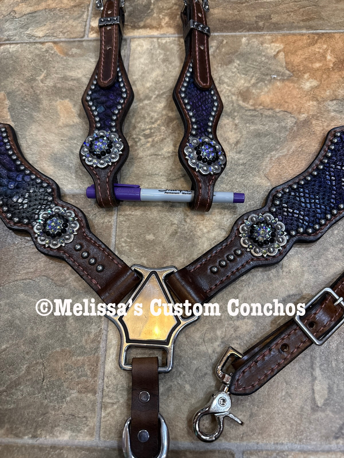 Show Brown oil tack set. Made by Melissa’s Custom Conchos. Purple Mermaid Overlay. Antique Silver Conchos and hardware. Paradise Shine and Jet Black Crystals. Horse size. One ear headstall.